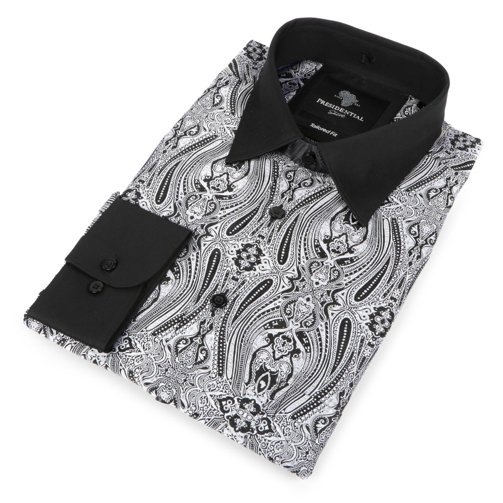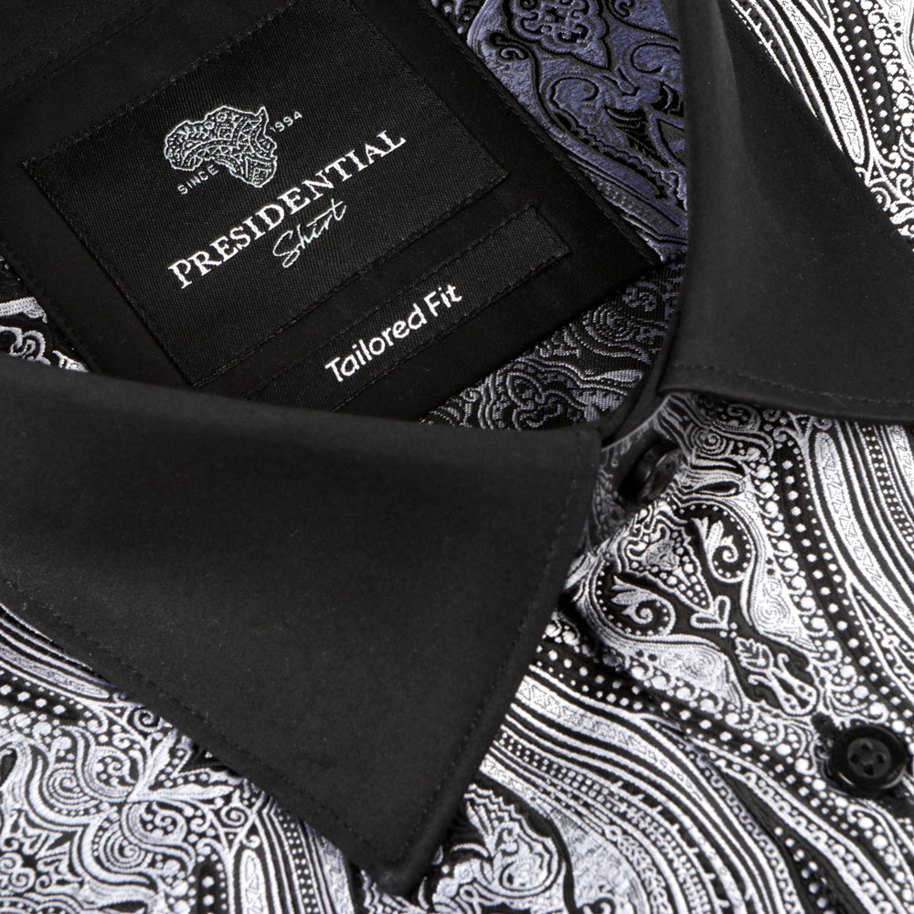 The Royal Prince in black exudes refined sophistication with a modern edge. Tailored from premium Jacquard Woven fabric, its striking monochrome pattern catches the light with a subtle sheen, creating depth and dimension. A sharp contrast collar and cuffs complete the design, giving it a regal presence. Cut in a tailored fit with a classic collar and single cuffs, this statement piece is perfect for formal occasions, evening events or moments when you want to command attention.